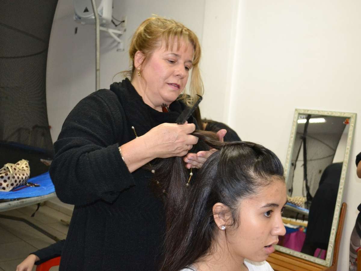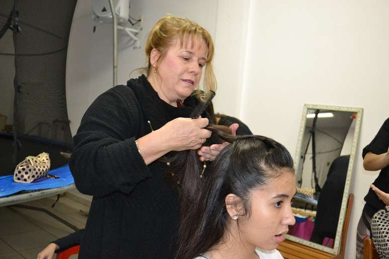 No backstage do desfile, duas cabeleireiras voluntárias preparavam os 30 modelos, entre crianças, jovens e adultos