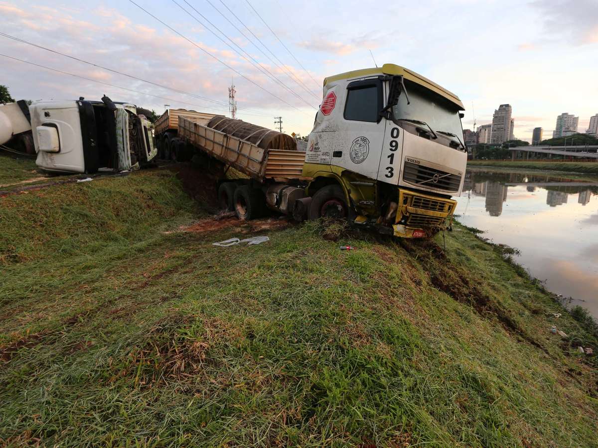 Um acidente envolvendo duas carretas complicou o trânsito na marginal Pinheiros na manhã desta quinta-feira. A colisão ocorreu na noite de ontem, na pista expressa sentido Interlagos, na altura da ponte Ary Torres. Um dos veículos atravessou a proteção da pista e quase caiu dentro do Rio Pinheiros. Não há informações sobre feridos.