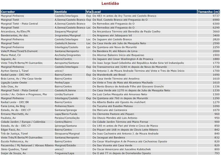 O segundo pior trecho na cidade estava na pista sentido Castello da marginal Tietê, entre o Cebolão e a ponte da Freguesia do Ó, com 6,9 quilômetros de lentidão. Ao todo, a cidade registrava 88 quilômetros de lentidão às 8h40. Veja os principais trechos de lentidão no horário: