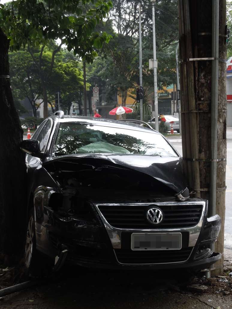 SP: após acidente, carro fica entre árvore e poste na zona sul