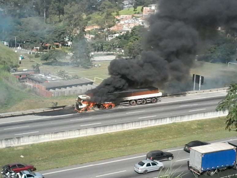 Um caminhão pegou fogo na manhã desta sexta-feira (22) na altura do quilômetro 27,5 da rodovia Ayrton Senna, próximo ao bairro dos Pimentas, em Guarulhos (SP). O incêndio começou por volta das 10h30 e bloqueou todas as faixas da via no sentido interior. O veículo estava no acostamento.