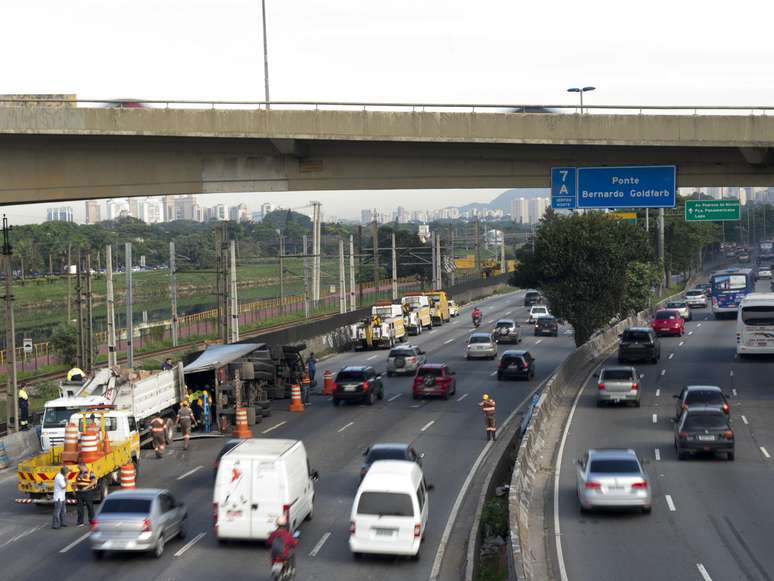Tombamento de carreta deixou o trânsito lento na Marginal Pinheiros na manhã desta quinta-feira