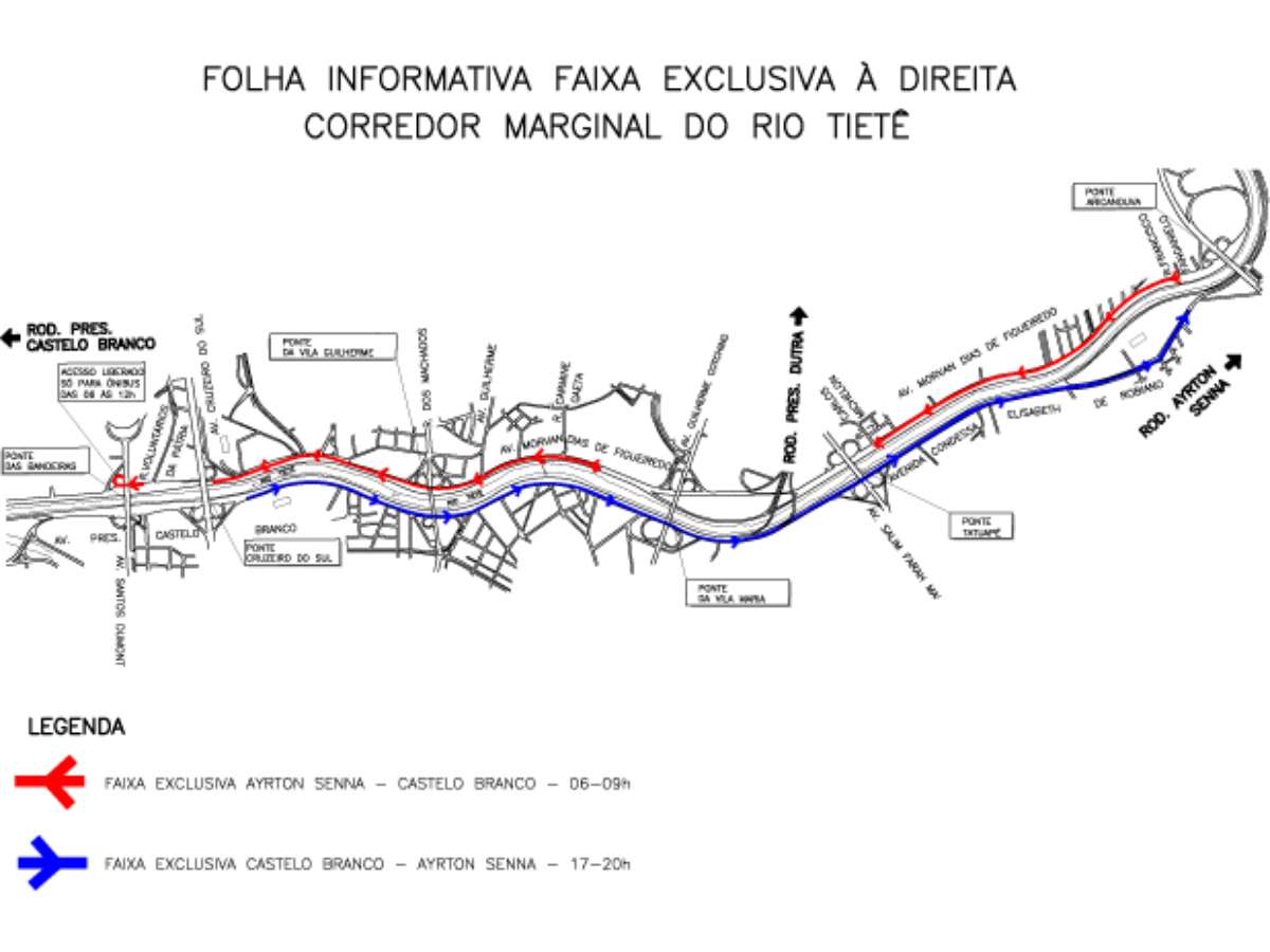 A exclusividade dos ônibus na nova faixa valerá de segunda à sexta-feira, das 6h às 9h em direção ao centro (sentido Castello Branco). No pico da tarde, das 17h às 20h, a faixa exclusiva para os ônibus vai operar em direção ao Bairro (sentido Ayrton Senna). Para sinalizar a faixa exclusiva de ônibus na Marginal Tietê, serão utilizadas 236 placas de regulamentação e advertência e pintados 2.676 metros quadrados de sinalização horizontal.