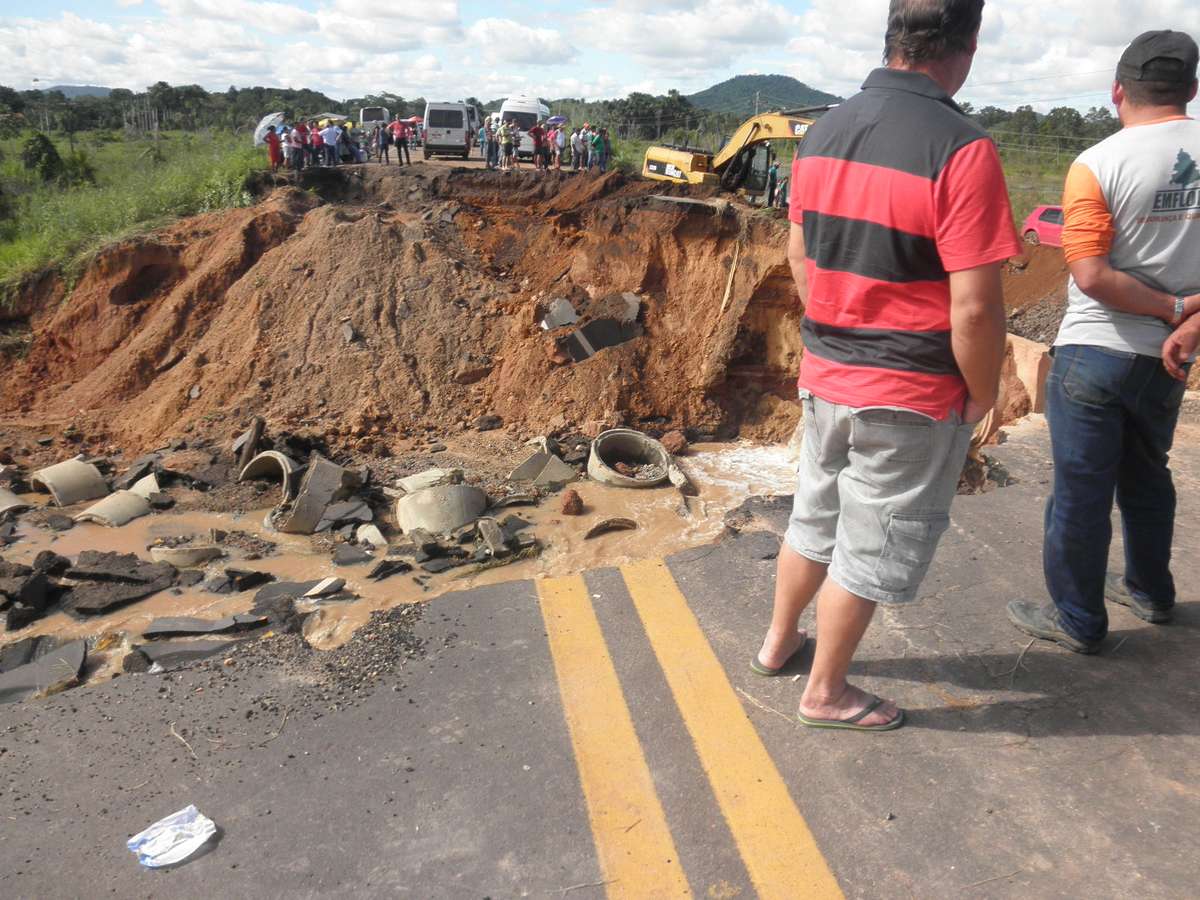 Segundo o Departamento Nacional de Infraestrutura de Transportes (Dnit), o volume de água causou o rompimento de um bueiro tubular triplo de concreto, levando parte da pista