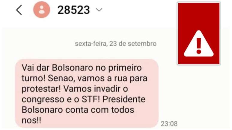"Vai dar Bolsonaro no primeiro turno! Senao, vamos a rua para protestar! Vamos invadir o congresso e o STF! Presidente Bolsonaro conta com todos nos!!", dizia o SMS (reproduzido aqui com a mesma grafia) enviado do número 28523. A mensagem anterior era uma singela, confirmando o agendamento do atendimento de um médico especialista.