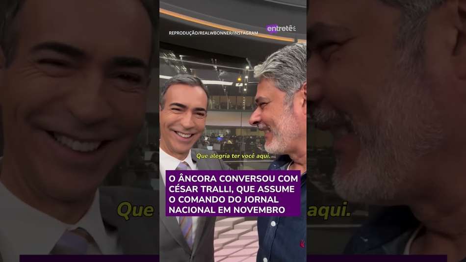 A brincadeira foi registrada pelo âncora do Jornal Nacional nesta segunda-feira, 13, em São Paulo. Bonner fez uma visita ao estúdio do Jornal Hoje durante o intervalo do noticiário e conversou com seu substituto, que assume a bancada do JN em novembro. Além do vídeo, ele publicou uma imagem lembrando os espectadores que faltam 18 dias para seu último dia no noticiário. César Tralli fez questão de deixar um comentário bem-humorado: "Quem deixou vc entrar no estúdio?! Pediu autorização?". #terranoticiasshorts Reprodução/realwbonner/Instagram