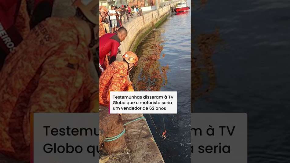 A situação ocorreu na madrugada desta quinta-feira, 21, na altura da Praça Mauá, no Centro da capital fluminense. O Corpo de Bombeiros foi acionado por volta da 1h05 e o veículo foi retirado da água nesta manhã. No entanto, o motorista não foi localizado. Testemunhas disseram à TV Globo que, dentro do carro, estaria um vendedor de 62 anos; o homem é conhecido na região por vender cocos e bebidas. Ainda não há informações sobre como o veículo foi parar na água. Divulgação/CBMERJ Reprodução/TV Globo