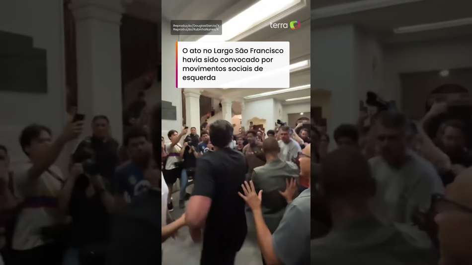 Empurra-empurra e agressões: ato da esquerda pelo 8 de janeiro tem confusão com bolsonaristas na USP. As cenas foram registradas nesta quinta-feira, 8, durante uma manifestação promovida por militantes no Salão Nobre da Faculdade de Direito da Universidade de São Paulo. Vídeos divulgados pelo vereador da capital paulista Rubinho Nunes (União) e pelo ex-deputado estadual Douglas Garcia (União) mostram o desentendimento no local. O ato no Largo São Francisco havia sido convocado por movimentos sociais de esquerda em função dos três anos completados hoje dos atos de 8 de janeiro de 2023. #terranoticiasshorts Reprodução/DouglasGarcia/X Reprodução/RubinhoNunes/X
