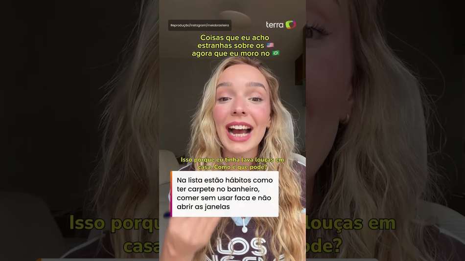 A influenciadora Bri Fancy, de 27 anos, apontou costumes que considera "estranhos" nos EUA. Na lista estão hábitos como ter carpete no banheiro, comer sem usar faca e não abrir as janelas. A norte-americana, que se define como "meio brasileira", viveu por anos em São Paulo e fala português fluente. #terranoticiasshorts Reprodução/Instagram/meiobrasileira
