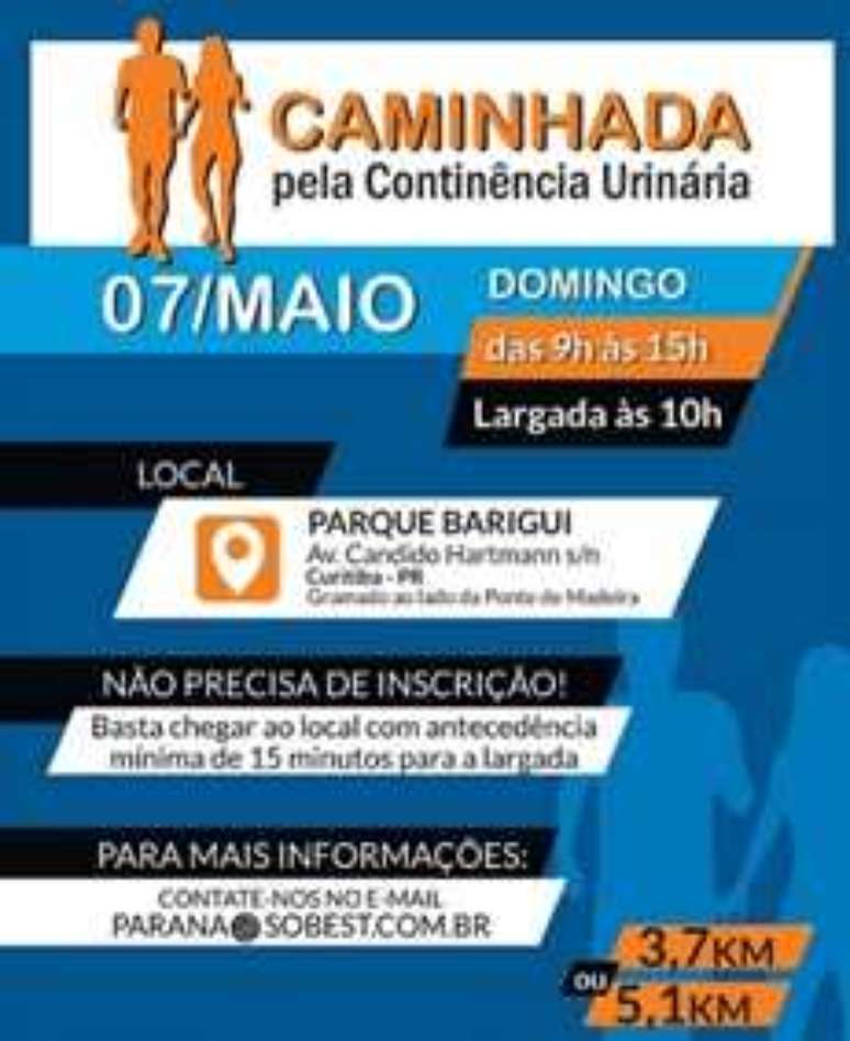 A incontinência urinária, a perda involuntária de urina, é uma condição que afeta cerca de 10 milhões de pessoas no Brasil. Ao contrário do que muitos pensam, pessoas de todas as idades podem apresentar os sintomas. Para conscientização a população sobre a importância do diagnóstico e dos tratamentos corretos, a Associação Brasileira de Estomaterapia - Seção Paraná e Associação Brasileira Pela Continência B. C. Stuart realizam, no próximo domingo (07/05), a Caminhada Pela Continência Urinária. O evento será no Parque Barigui, com largada às 10h. Serão dois percursos, de 3,7 km e 5,1 km. Não é necessária a inscrição; os participantes só precisam chegar com 15 minutos de antecedência, para aquecimento e alongamento. Também no domingo, das 9h às 15h, profissionais de saúde estarão no parque, orientando a população sobre o tema.