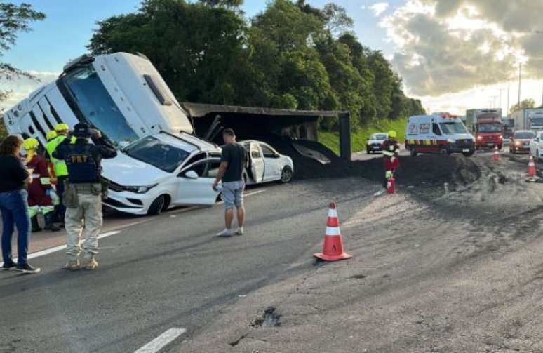 A ocorrência, registrada por volta das 17h30, envolveu um caminhão carregado de carvão mineral e dois carros - um Fiat Siena e um Renault Sandero. Segundo a Polícia Rodoviária Federal (PRF), o caminhão tombou sobre os veículos após o motorista frear bruscamente para evitar a colisão com uma carreta.