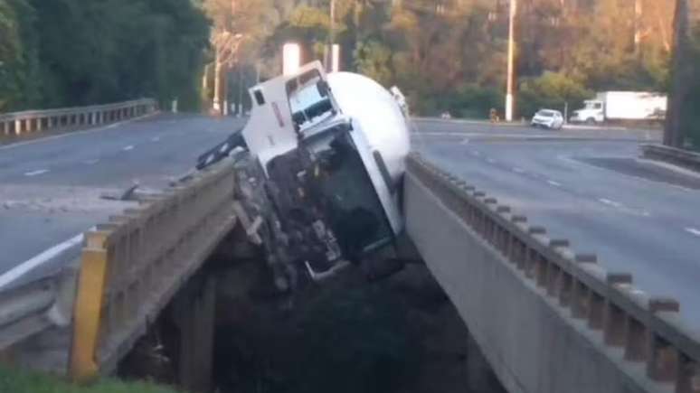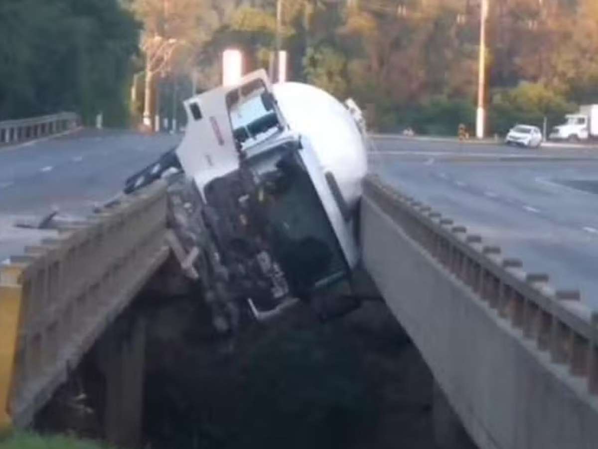 Caminhão que transportava gás capota e fica suspenso entre duas pontes no RS