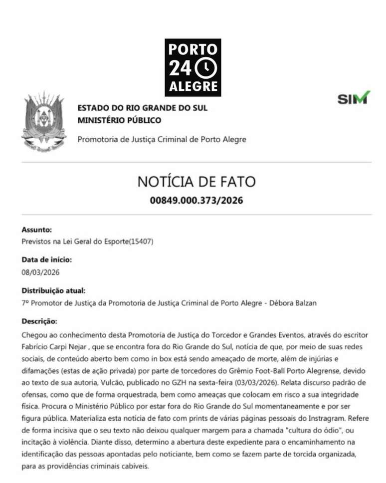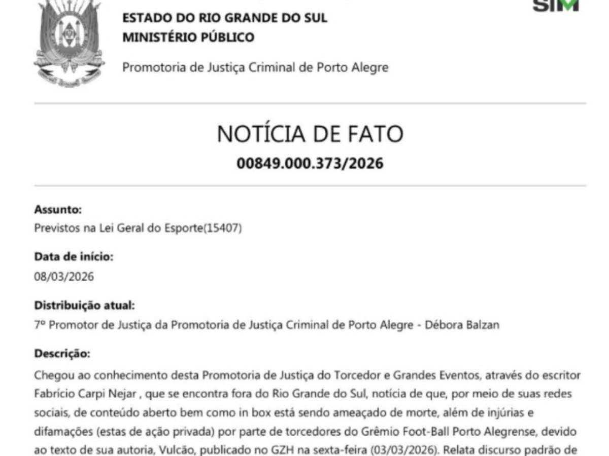 O escritor e cronista Fabrício Carpinejar registrou neste domingo (08), uma denúncia na Promotoria de Justiça Criminal de Porto Alegre após receber ameaças de morte pela internet. Segundo ele, as mensagens teriam sido enviadas por torcedores do Grêmio.