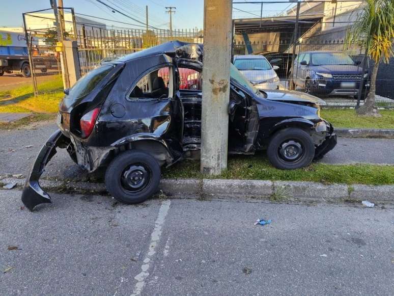 Antes de colidir contra o poste, o carro teria batido em uma árvore. Com o impacto, o lado do passageiro ficou destruído.