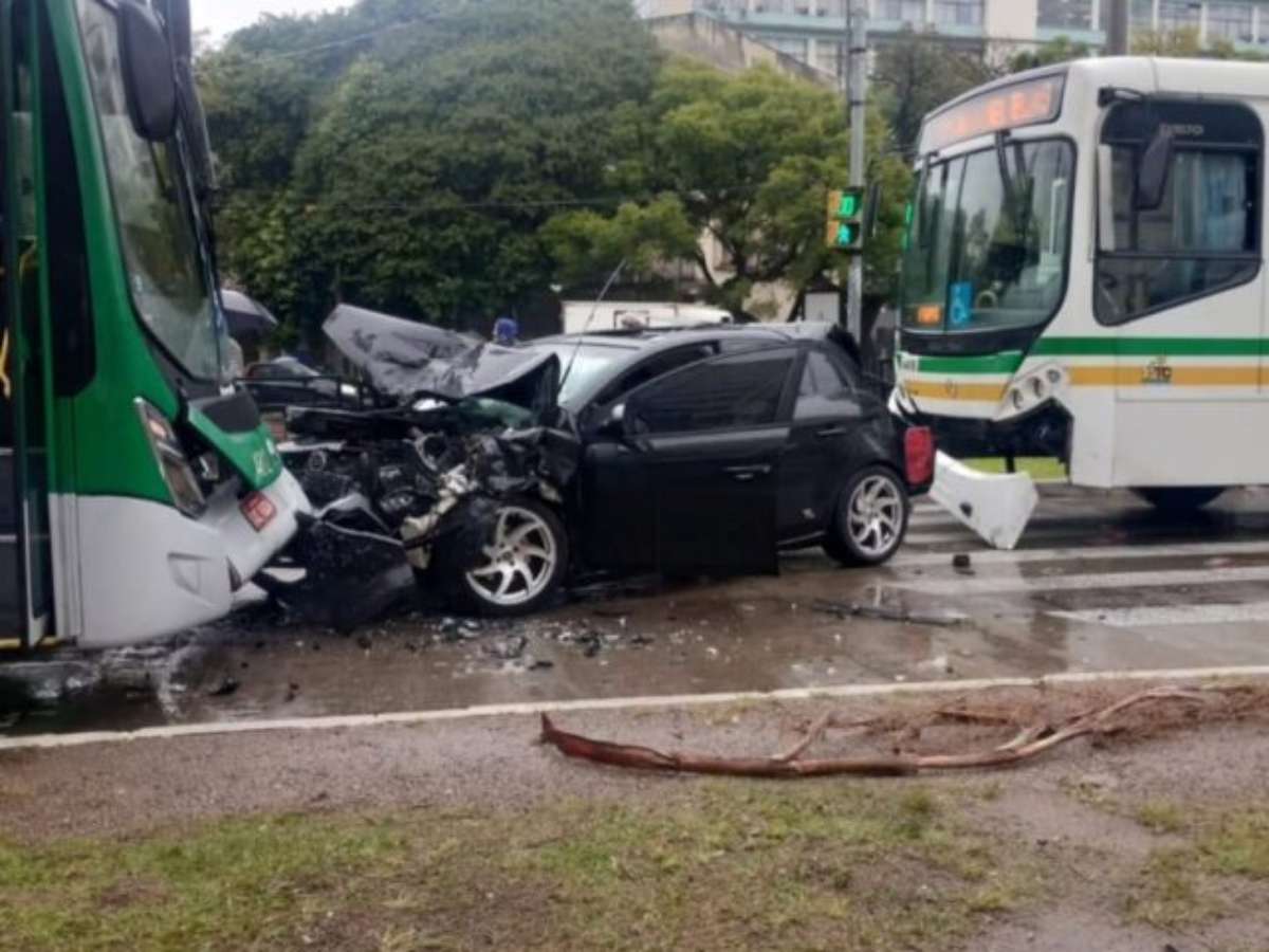 Carro invade corredor de ônibus e provoca acidente com dois coletivos em Porto Alegre
