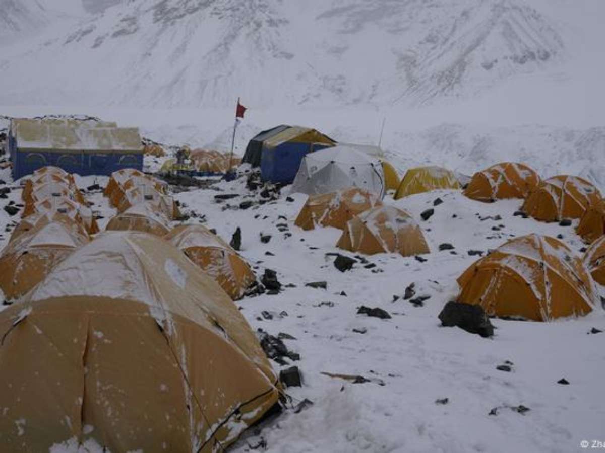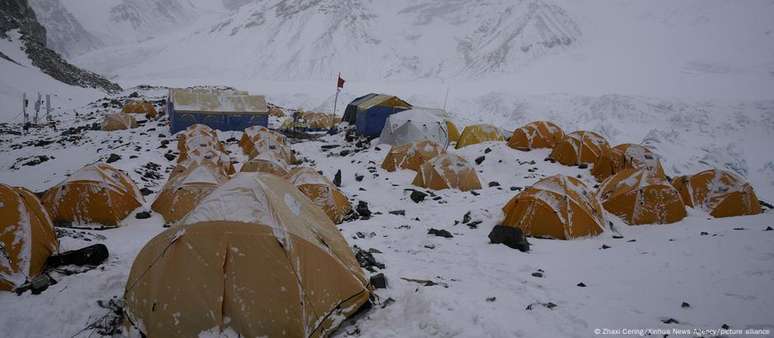 O Monte Everest tem cerca de 8,8 mil metros. Um campista que conseguiu descer antes que a neve bloqueasse o caminho disse ao portal que a neve já alcançava um metro de profundidade na região do acampamento e havia destruído barracas.