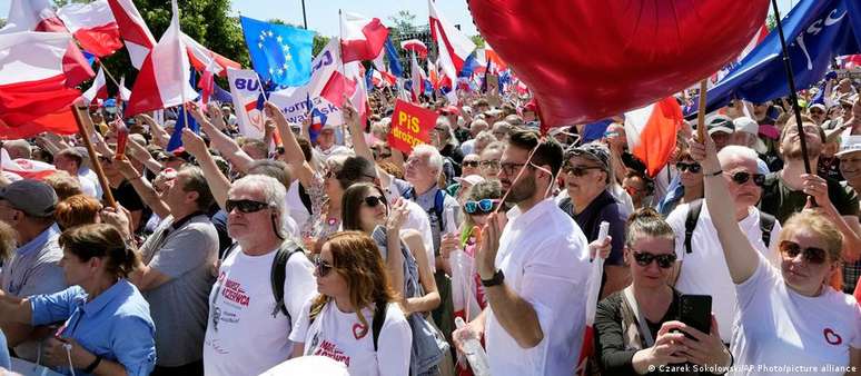Grandes multidões também se reuniram em Cracóvia e outras cidades do país de 38 milhões de habitantes, a poucos meses das eleições legislativas. Muitos participantes exibiram bandeiras da UE e da Polônia, com alguns também segurando símbolos do arco-íris.