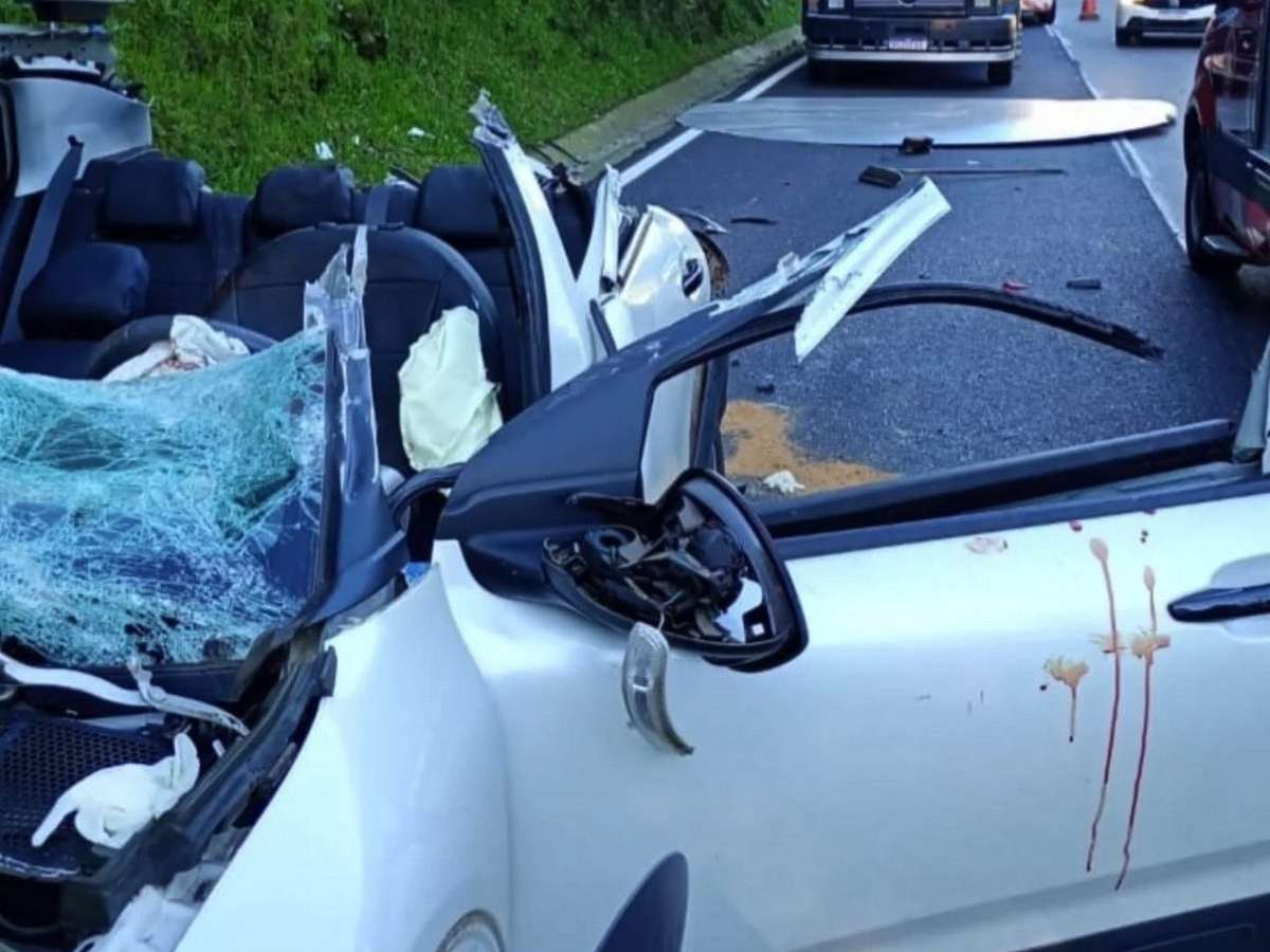Chapa metálica voa de caminhão e corta carro ao meio na RSC-453