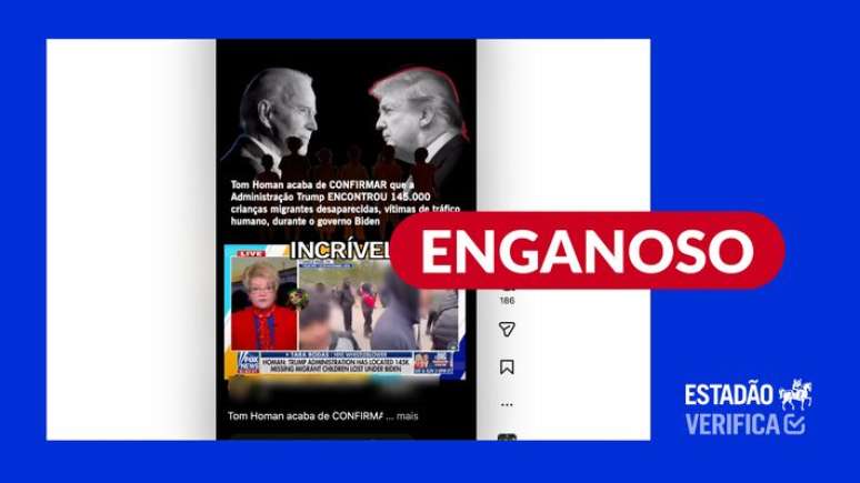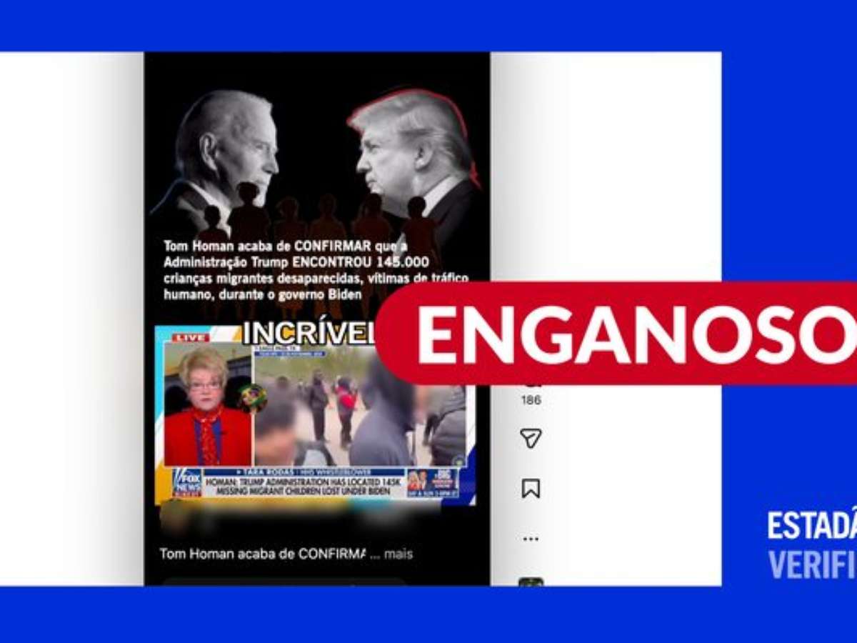 O Estadão Verifica investigou e concluiu que: é enganoso. Homan não disse que 145 mil crianças foram vítimas de "tráfico humano". Na realidade, ele comentou sobre a situação de crianças estrangeiras que chegam ao país de forma irregular e estão desacompanhadas dos pais ou guardiões legais. Essas crianças, que passam por processos migratórios e podem ser deportadas, costumam ser entregues a adultos que se oferecem para acolhê-las temporariamente. São os chamados "patrocinadores".