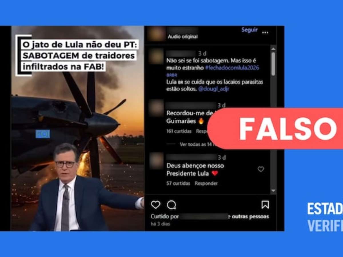 Um vídeo publicado no Instagram sobre o assunto especula que o avião teria sido "sabotado por traidores na FAB". Quem faz a alegação é um homem que se assemelha ao apresentador de TV norte-americano Stephen Colbert. Porém, o jeito como ele formula as frases e a falta de sincronia entre a voz e os movimentos da boca sinalizam que a imagem dele foi adulterada por ferramentas de inteligência artificial (IA).