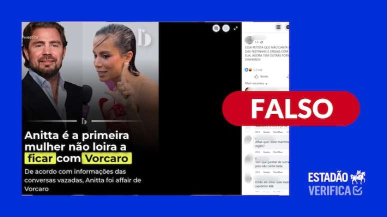 O Estadão Verifica investigou e concluiu que: é falso. Nenhuma das conversas de Vorcaro divulgadas até o momento indicam um relacionamento com Anitta. A artista foi citada apenas quando o banqueiro falava sobre uma reunião com empresários do setor de apostas esportivas. Procurada, a assessoria da cantora afirmou que a postagem analisada pelo Verifica é "totalmente falsa".