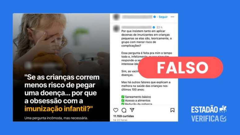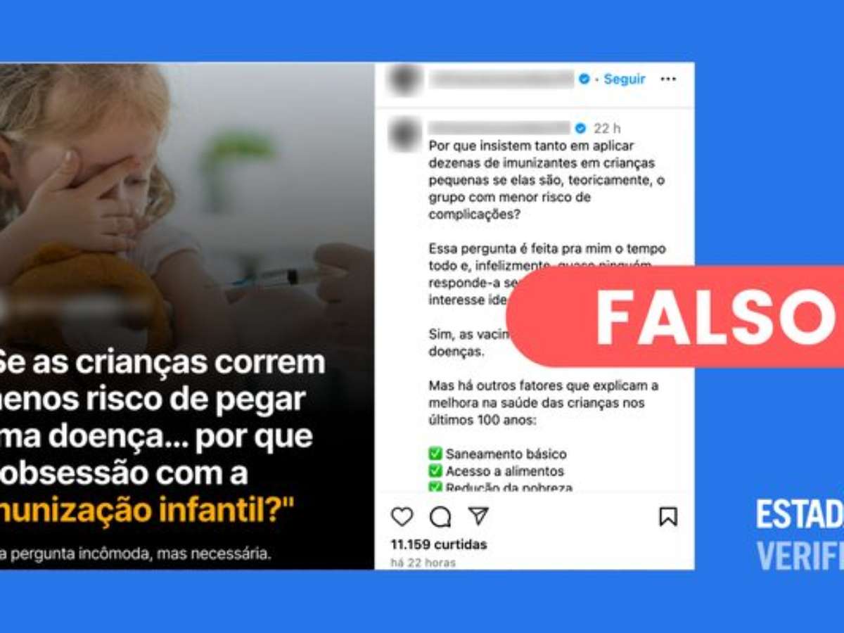 O que estão compartilhando: postagem no Instagram questiona: "Se as crianças correm menos risco de pegar uma doença… por que a obsessão com imunização infantil?". Na legenda, o autor do post, reconhece que as vacinas ajudaram a reduzir doenças. "Mas há outros fatores que explicam a melhora na saúde das crianças nos últimos 100 anos: saneamento básico, acesso a alimentos, redução da pobreza", argumenta.