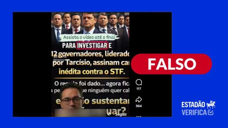 Há, ainda, no mesmo canal, uma outra versão que também viralizou nas redes sociais. A alegação desse segundo vídeo, postado no dia 9, é de que 18 governadores de Estados conservadores teriam assinado carta conjunta declarando desobediência cívica ao STF. Tarcísio de Freitas teria liderado o movimento, com o anúncio sendo feito em coletiva simultânea nas capitais dos Estados. Tudo falso.
