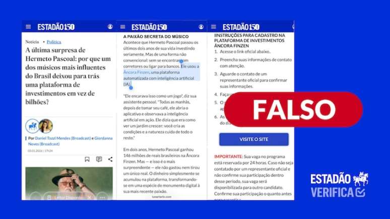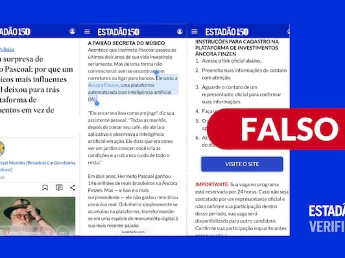 O Estadão Verifica investigou e concluiu que: é falso. O conteúdo que circula pelas redes sociais imita a identidade visual do jornal e usa, indevidamente, as assinaturas de dois repórteres na tentativa de dar credibilidade ao conteúdo inventado, com falsa data de publicação em 3 de janeiro de 2026. O Estadão não publicou nenhuma notícia sobre investimentos feitos por Hermeto Pascoal, nem divulgou como investir na suposta plataforma online.