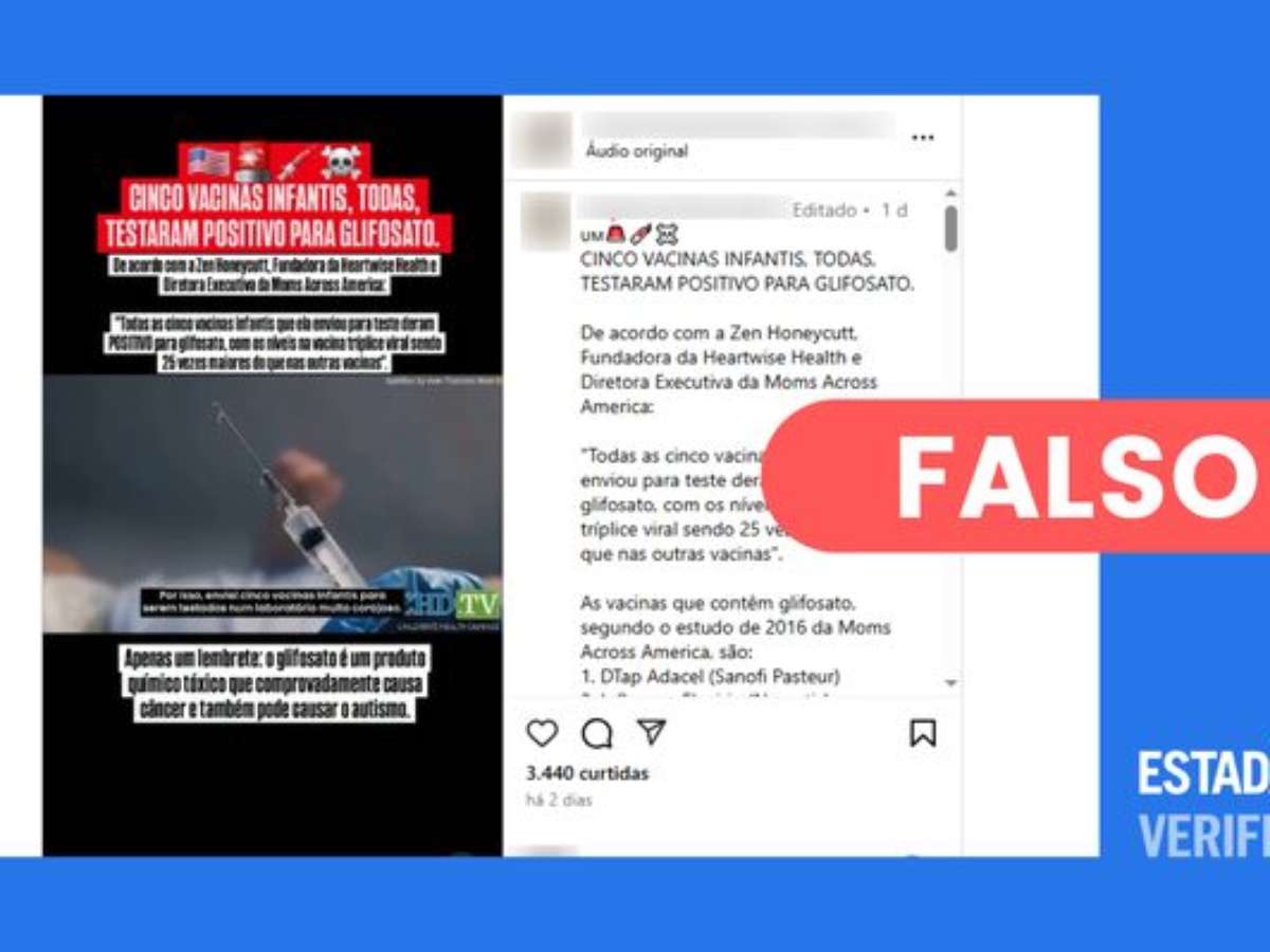 Saiba mais: publicado no Instagram, o post verificado exibe um vídeo em que a americana Zen Honeycutt, fundadora da organização Moms Across America, afirma ter enviado cinco vacinas infantis a um laboratório para serem testadas quanto à presença de glifosato. No vídeo, ela diz que todas testaram positivo para o herbicida.