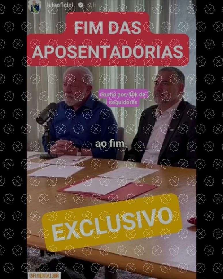 As peças checadas difundem um frame da entrevista que Lula concedeu à Rádio Gaúcha em 29 de junho. Na ocasião, o presidente não disse em nenhum momento que acabará com as aposentadorias. Ao lado do mandatário estava o ministro-chefe da Secom, Paulo Pimenta, que compartilhou um trecho da entrevista no Instagram.