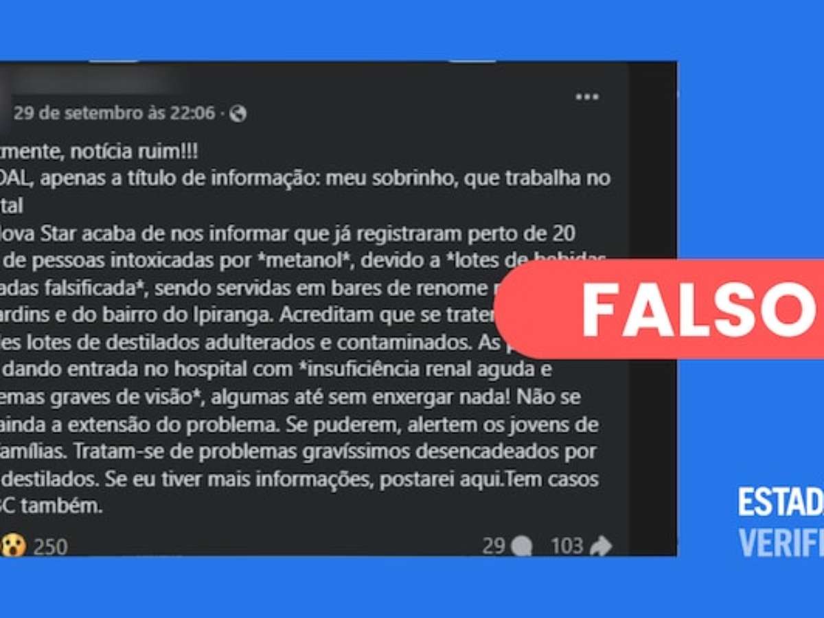 O Estadão Verifica investigou e concluiu que: é falso. O hospital negou ter registrado 20 casos de intoxicação por metanol. Por telefone, a assessoria da unidade informou ao Verifica que as alegações que circulam nas redes sociais não procedem, pois não há nenhum caso de contaminação em atendimento no Vila Nova Star. De acordo com o boletim mais recente divulgado pelo Ministério da Saúde, em todo o País há 225 registros de intoxicação pela substância, entre casos investigados e confirmados.