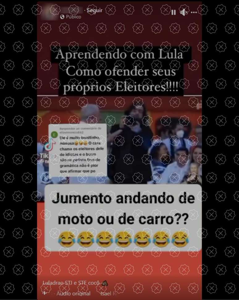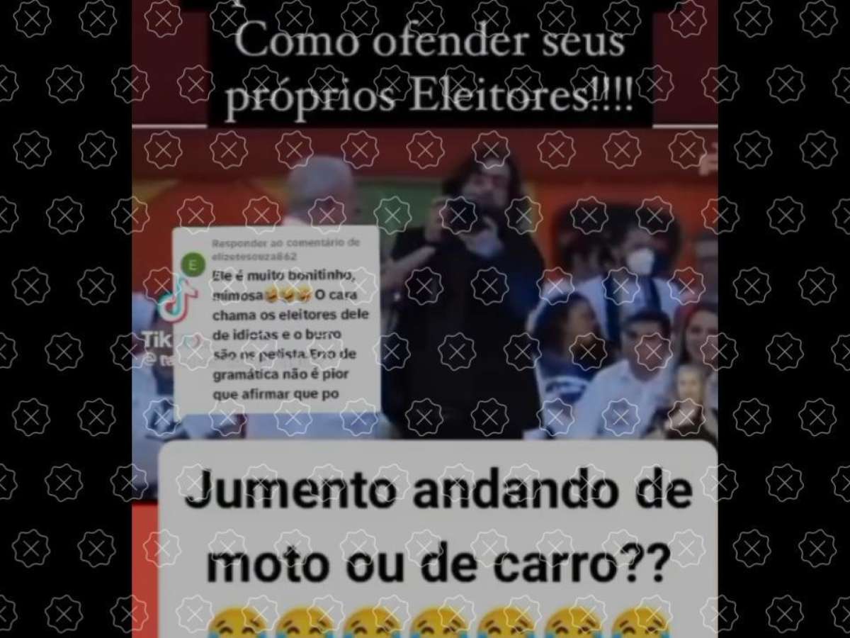 O presidente Luiz Inácio Lula da Silva (PT) não chamou seus apoiadores de jumentos, como fazem crer publicações que circulam nas redes. Uma fala do petista em ato no Ceará em julho de 2022 foi tirada de contexto. Na ocasião, o petista citou o animal, símbolo do Nordeste, ao prometer aumentar o acesso da população a veículos motorizados: "eu não quero que o jumento seja abandonado, mas eu quero vocês andando de moto ou de carro, sabe?".