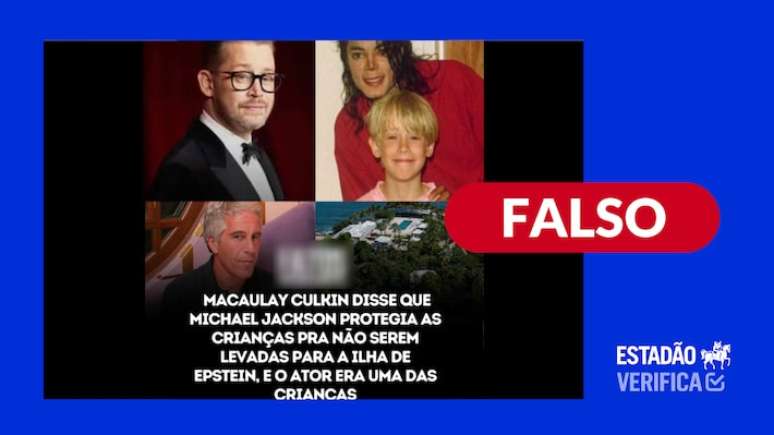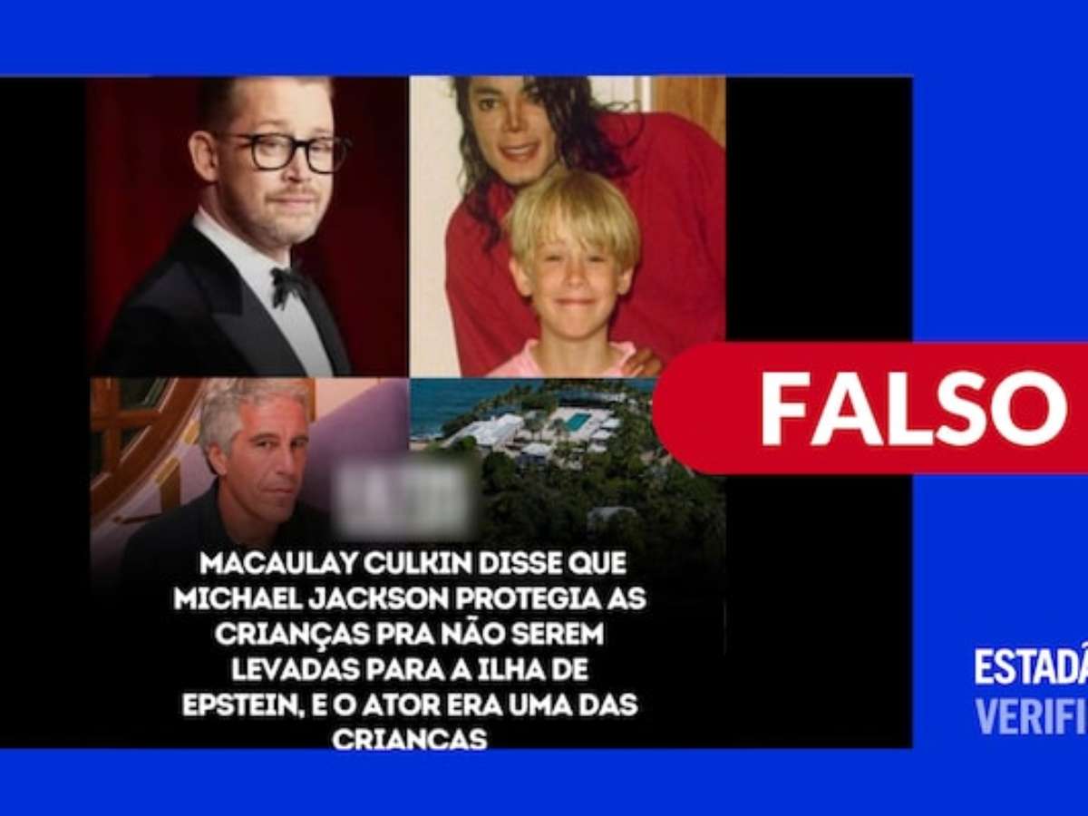 O que estão compartilhando: que o ator Macaulay Culkin teria dito que o cantor Michael Jackson impediu que ele fosse levado para a ilha do empresário Jeffrey Epstein, apontado como líder de uma rede de exploração e tráfico sexual de menores de idade.