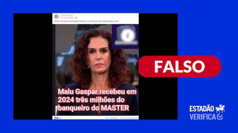 O Estadão Verifica checou e concluiu que: é falso. A colunista não consta na lista de investigados pela Polícia Federal na Operação Compliance Zero. Gaspar não é citada em nenhum dos vazamentos sobre o caso Master divulgados na imprensa até o momento. Ao Verifica, ela afirmou que a alegação não é verdadeira.