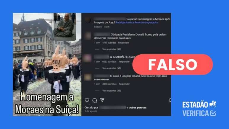 Saiba mais: a postagem foi feita dois dias após Moraes ter sofrido a sanção da lei Magnitsky. No mesmo dia, ele foi flagrado fazendo um gesto obsceno durante um clássico entre Corinthians e Palmeiras, pelas oitavas de final da Copa do Brasil. "Suíça faz homenagem a Moraes após imagens do Jogo!", escreveu o autor do conteúdo checado na legenda. Até a publicação desta checagem, a postagem foi vista mais de 1,7 milhões de vezes.