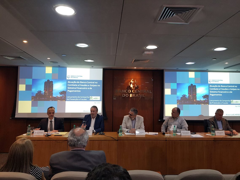Campanha. Palestrantes durante o evento de lançamento da campanha "Tem cara de golpe" na sede do Banco Central em São Paulo (Marco Faustino/Aos Fatos)