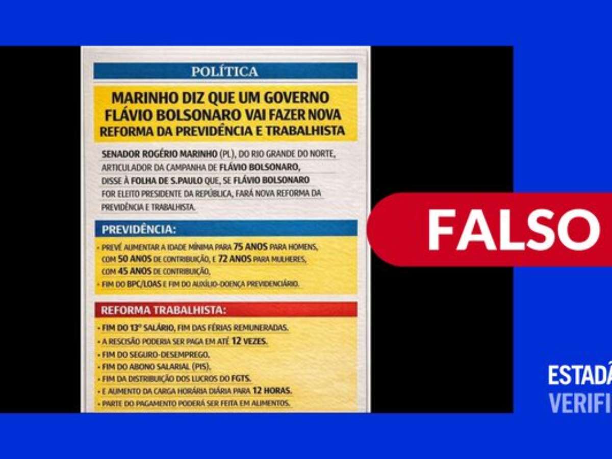 O Estadão Verifica investigou e concluiu que: é falso. Não há registro de nenhuma declaração de Flávio nesse sentido. A postagem distorce um comentário do senador Rogério Marinho (PL-RN), coordenador da campanha de Bolsonaro. Marinho disse que um eventual governo de Flávio discutiria reformas na Previdência e na área trabalhista, mas não detalhou quais mudanças seriam propostas.
