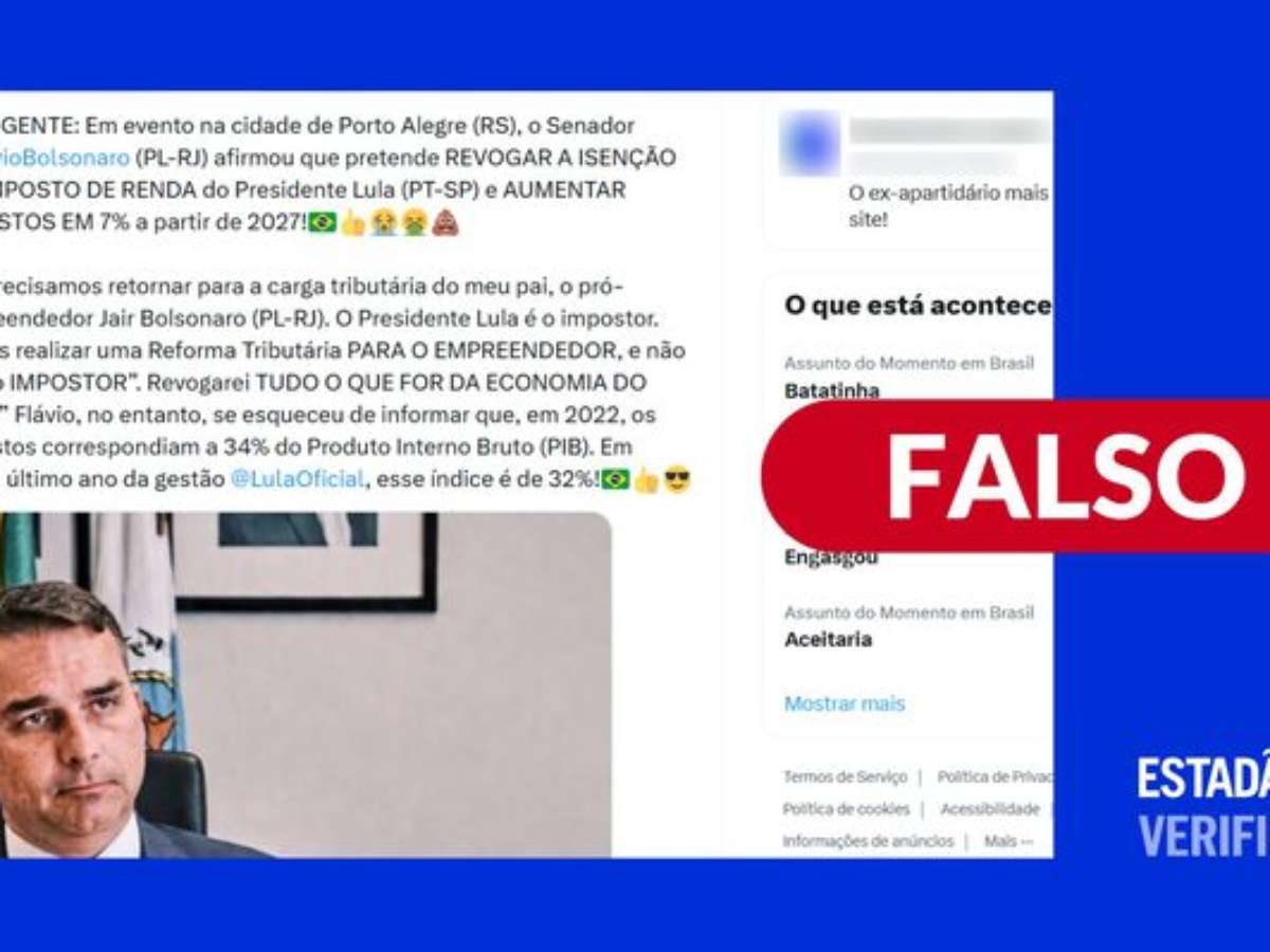 O Estadão Verifica investigou e concluiu que: é falso. Não há registros que Bolsonaro tenha feito tais declarações. O senador esteve na capital gaúcha nos dias 10 e 11 de abril, mas não defendeu o fim da isenção nem o aumento de IR durante a visita. A assessoria de Flávio afirmou que a postagem é mentirosa e reiterou que ele defende a redução da carga tributária e a liberdade econômica.