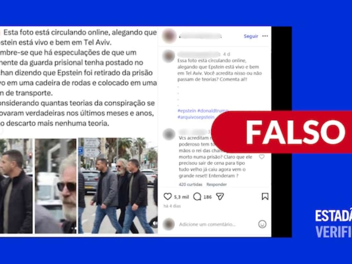 O Estadão Verifica checou e concluiu que: é falso. A imagem foi gerada com inteligência artificial. A ferramenta SynthID, do Google, identificou uma marca d'água que comprova a criação digital da foto por IA. Epstein foi encontrado morto na cela de prisão em 2019. Novas imagens divulgadas pelo Departamento de Justiça dos Estados Unidos no fim de janeiro deste ano mostram o corpo sem vida do bilionário. O governo americano também publicou detalhes da autópsia de Epstein.