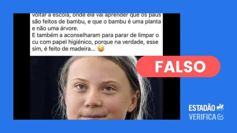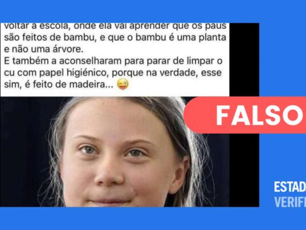 Saiba mais: o post circula em um card com a foto de Greta Thunberg e o texto com as alegações na parte de cima. A mensagem se inicia com a frase "Isto é demasiado bom para deixar passar!" e termina com a alegação de que os chineses ainda teriam aconselhado ela a deixar de usar papel higiênico, pois este sim é feito de madeira. No entanto, nada disso é verdade.