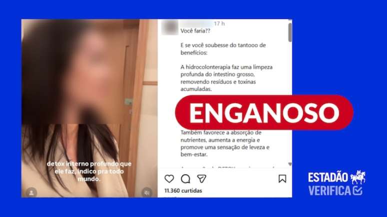 Isso não aparece no conteúdo do vídeo, nem na legenda do post. O texto apontava para uma série de supostos benefícios e acrescentava que o procedimento era "super acessível" na clínica onde foi feito. A influenciadora chega a dizer que é um detox profundo indicado para "todo mundo".