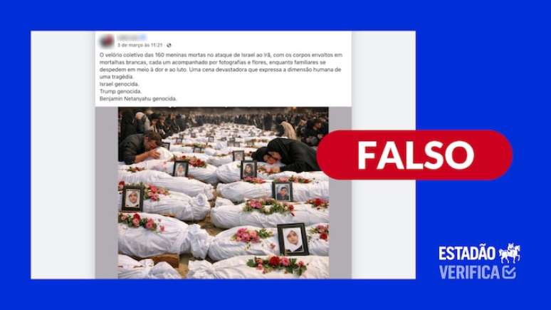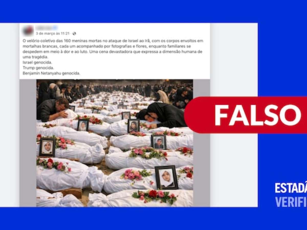 Saiba mais: A imagem analisada foi postada no Facebook dia 3 deste mês e diz mostrar "o velório coletivo das 160 meninas mortas no ataque de Israel ao Irã, com os corpos envoltos em mortalhas brancas, cada um acompanhado por fotografias e flores, enquanto familiares se despedem em meio à dor e ao luto".