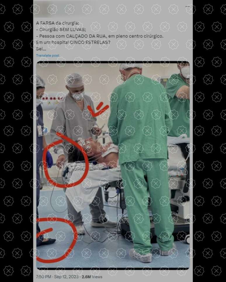 Publicações nas redes enganam ao afirmar que o ex-presidente Jair Bolsonaro (PL) teria forjado um procedimento cirúrgico em São Paulo na última terça (12). Para sustentar a alegação falsa, os posts apontam que o cirurgião estaria sem luvas e que uma das profissionais não estaria com os sapatos cobertos. De acordo com a equipe médica, o homem na verdade é técnico de enfermagem e estava sem luvas porque o procedimento já havia terminado. Já o uso de protetor de calçados não é uma exigência sanitária.
