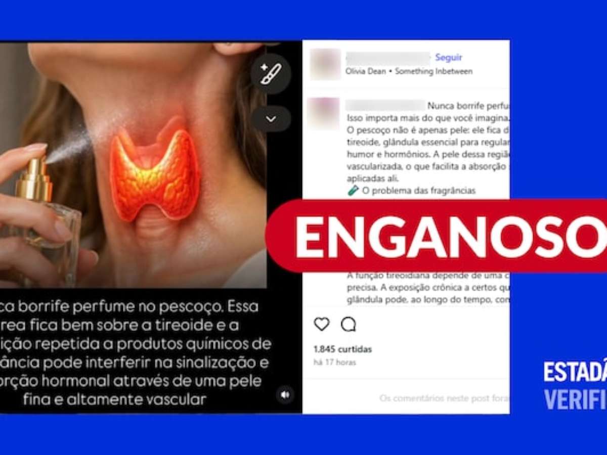 O Estadão Verifica investigou e concluiu que: é enganoso. Não há evidências científicas que justifiquem essa recomendação, nem estudos que comprovem a relação de causa e efeito entre o uso de perfume no pescoço e problemas na tireoide. Mesmo que ficasse provado que perfumes podem causar alterações hormonais, não faria diferença nenhuma evitar a área do pescoço. Endocrinologistas ouvidas pelo Verifica explicaram que a absorção do produto independe da área onde ele é aplicado. Saiba mais abaixo.