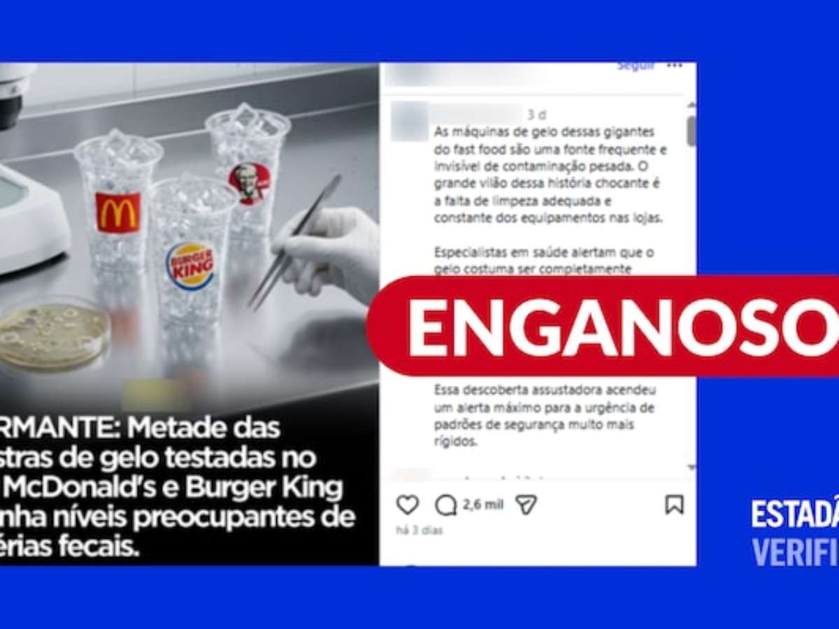 Pesquisa que encontrou bactérias fecais em gelo de fast foods é de 2017 e não foi feita no Brasil
