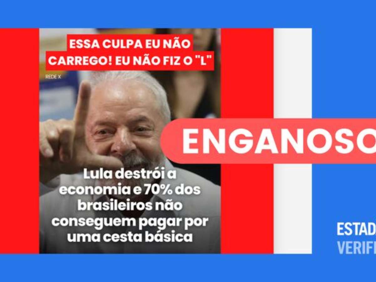 O que estão compartilhando: uma foto do presidente Luiz Inácio Lula da Silva acompanhada da afirmação de que ele destruiu a economia e que "70% dos brasileiros não conseguem pagar por uma cesta básica".