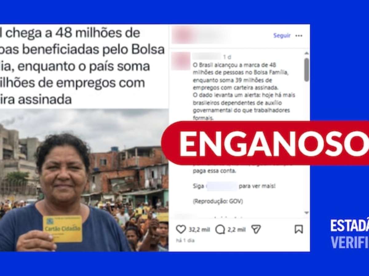 O Estadão Verifica investigou e concluiu que: é enganoso. Embora os números de pessoas atendidas pelo Bolsa Família e de empregados com carteira assinada estejam corretos, a postagem engana ao fazer parecer que há mais pessoas dependentes de auxílio do que trabalhadores no Brasil.