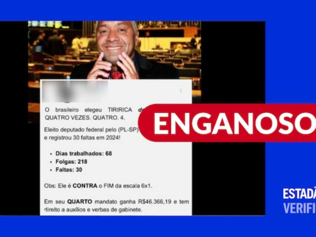 O Estadão Verifica investigou e concluiu que: é enganoso. Dados disponíveis no site da Câmara dos Deputados indicam que, em 2024, houve 87 dias de sessões no Plenário ao longo do ano. Desses, Tiririca compareceu a 78, registrou sete ausências justificadas e duas não justificadas. A peça verificada distorce os números ao somar faltas registradas no mesmo dia em sessões plenárias e em reuniões de comissões como se fossem dias distintos, além de considerar como ausência datas em que o deputado esteve presente no Plenário, mas não participou de comissões. Isso ocorre porque um mesmo dia pode ter várias reuniões e gerar mais de um registro de falta, sem que isso corresponda a dias diferentes de ausência (entenda mais abaixo).