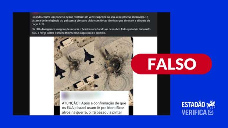 Uma das alegações virais é a de que o Irã estaria "enganando" os Estados Unidos e Israel por meio de pinturas no solo. Publicações que acumulam milhares de visualizações compartilham uma imagem que mostraria a estratégia do país persa de desenhar silhuetas que simulam caças F-14.