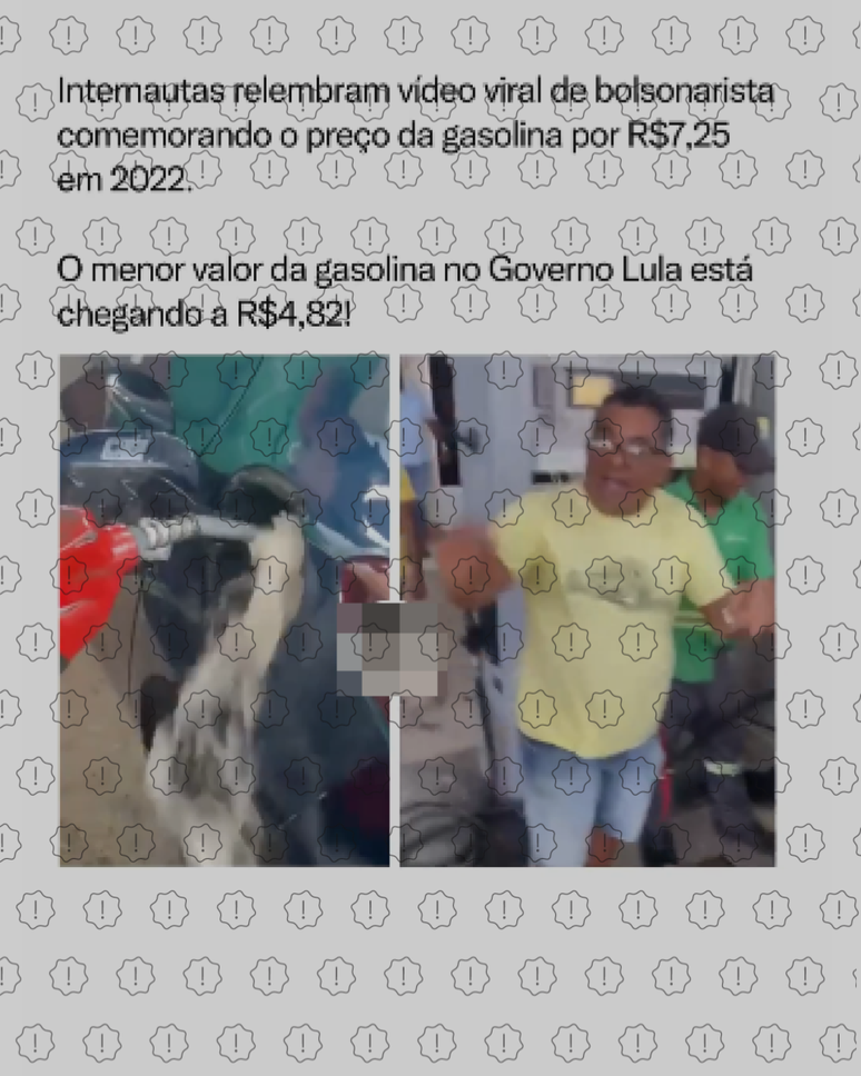 Publicações têm usado desinformação para zombar de um bolsonarista que viralizou nas redes em julho de 2022 ao gravar um vídeo desperdiçando gasolina e fazendo uma lavagem em seu carro com o combustível. Segundo as peças, o homem teria comemorado quando a gasolina estava em R$ 7,25, enquanto o valor do combustível hoje, no governo Lula, é de R$ 4,82. As peças, no entanto, distorcem os preços e omitem o contexto da gravação.